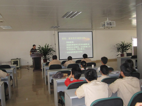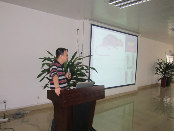 受大型外資企業(yè)大海糧油(防城港)有限公司邀請(qǐng),2011年11月8日康凈公司派出技術(shù)副總監(jiān)古凡煜先生到該企業(yè)講授病媒生物防制專業(yè)理論知識(shí)。圖為古凡煜副總監(jiān)在會(huì)上授課