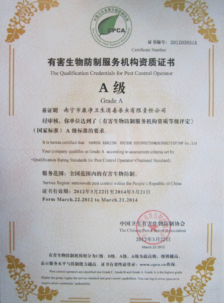 2012年3月21日-24日,中國(guó)衛(wèi)生有害生物防制協(xié)會(huì)2012年年會(huì)暨第四屆三次理事會(huì)在六朝古都南京市隆重召開,康凈公司被授予“中國(guó)有害生物防制服務(wù)機(jī)構(gòu)資質(zhì)A級(jí)證書”。年會(huì)是我國(guó)有害生物防制行業(yè)界最具規(guī)模與影響力的年度盛會(huì),屆時(shí),全國(guó)協(xié)會(huì)及會(huì)員單位、外國(guó)協(xié)會(huì)、省市地方協(xié)會(huì)(港臺(tái)協(xié)會(huì))、愛衛(wèi)系統(tǒng)、疾控系統(tǒng)、科研院校、藥械生產(chǎn)與經(jīng)營(yíng)企業(yè)、PCO企業(yè)等有關(guān)人士齊聚一堂,本次會(huì)議以“除四害與愛國(guó)衛(wèi)生運(yùn)動(dòng)——紀(jì)念愛國(guó)衛(wèi)生運(yùn)動(dòng)開展60周年”為主題,并對(duì)2011年通過A級(jí)資質(zhì)考評(píng)的全國(guó)10家PCO公司正式頒發(fā)資質(zhì)證書。圖為(中國(guó)衛(wèi)生有害生物防制協(xié)會(huì))秘書長(zhǎng)楊華林先生、(歐洲有害生物管理業(yè)協(xié)會(huì))總干事Rob Fryatt 先生作報(bào)告,及頒發(fā)證書現(xiàn)場(chǎng)。
